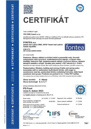 Mezinárodní standard bezpečnosti potravin. Certifikát na úrovni Higher Level, získaný 11. ledna 2007 při prvním certifikačním auditu.